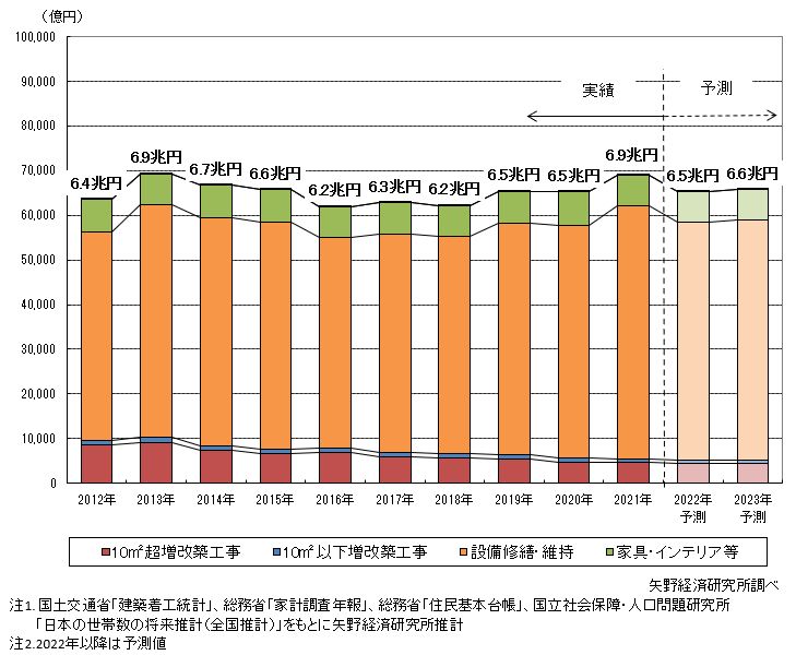 2023年のリフォーム市場については、矢野経済研究所が2022年に比べて微増の6.6兆円の市場規模を予測している。中古販売が堅調を維持し、そのリフォーム需要が見込めること、国が性能向上改修の補助・優遇を充実させることから、市場の拡大を期待できそうだ。