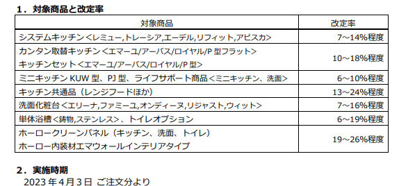 タカラスタンダード(大阪市)は1月5日、一部製品の希望小売価格を4月3日の注文分より、最大で26%値上げすると発表した。資材価格の高騰が依然として続くなか、急激な円安による為替の影響を受けるなど、企業努力だけでは対応困難な状況になったとして価格改定を決めた。対象製品と改定率は以下の通り。