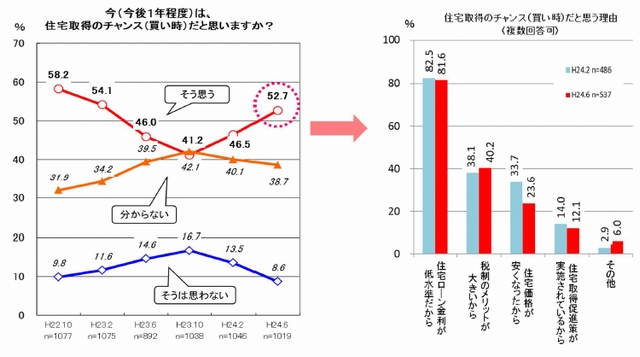 住宅金融支援機構は9月27日、民間の住宅ローン利用予定者などを対象に今年6月に行った調査結果を発表した。住宅ローン利用予定者のうち、「今は住宅の買い時」だとする回答者の割合は52.7%で、前回2月に行った調査の46.5%から6.2ポイント増えた。買い時と思う理由(複数回答)では、ローンの低金利が81.6%でもっと多く、税制のメリットが40.2%で続いた。