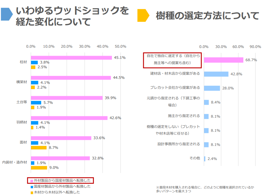 ウッドショックを経て国産材製品に転換した工務店は、柱材で45.1%、横架材で44.5%、羽柄材で42.6%に達した。土台等は39.9%、面材は33.6%、内装材・造作材は32.8%。転換しなかったと見られる「無回答」は、いずれの部材も半数程度だった。68.7%が「自社で独自に(樹種を)選定する」または「自社から施主等に(樹種を)提案する」と答えており、自社の考えで国産材を選んだことが分かる。
