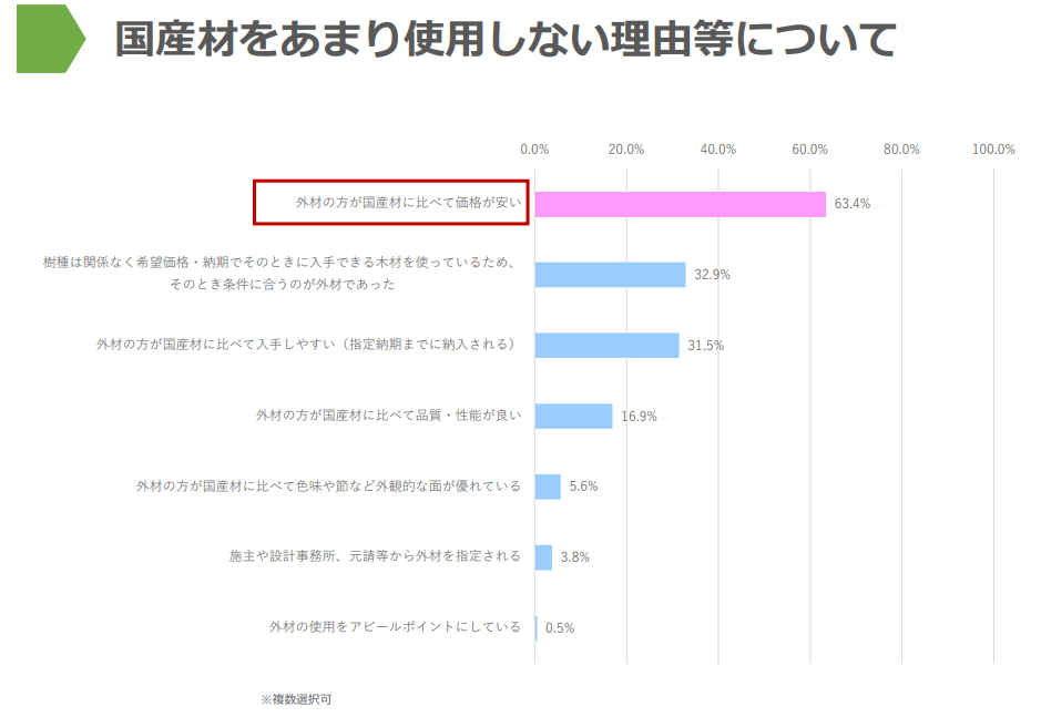 これまで国産材を使用しなかった理由について、「外材の方が安い」(63.4%)、「希望価格・納期などの条件に合うのが外材だった」(32.9%)、「外材の方が入手しやすい」(31.5%)との回答が目立ったことから、外材の高騰により両者の価格差が縮まり、比較的入手しやすい国産材を選ぶケースが増えたと考えられる。