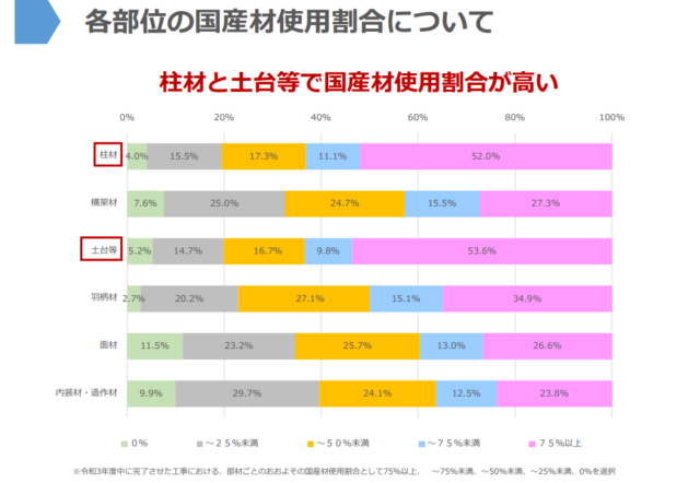 国産材を使用する割合は、土台等(53.6%)、柱材(52.0%)で高く、次いで羽柄材34.9%、横架材27.3%、面材26.6%、内装材・造作材23.8%の順だった。