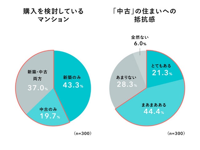 中古住宅のオンラインマーケット「カウカモ」を運営するツクルバ(東京都目黒区)は1月10日、2023年にマンション購入を希望する一都三県在住の300人を対象に実施した、住まい探しに関する意識調査の結果を発表した。購入希望のマンションについて、「新築のみ」を検討する人は43.3%で、中古マンションを含めて検討(「中古のみ」19.7%、「新築・中古両方」37%)する人は56.7%と半数以上になることがわかった。一方、65.7%が「中古の住まいに抵抗感がある」と回答しており、中古マンションの存在感が高まっているものの抵抗感を示す人も多いことがうかがえる。