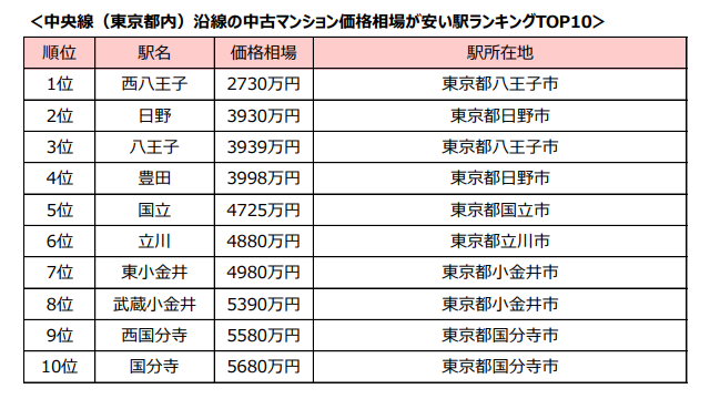 中央線(東京都内)沿線の中古マンションで、価格相場が最も安かったのは八王子市にある西八王子駅で、価格相場は2位より1200万円も安い2730万円だった。中央線の都内最西端の駅である高尾駅の一つ手前に位置し、JR中央線の快速と通勤特快を乗り継ぐと新宿駅まで約48分、東京駅までは約1時間2分で到着する。2位は日野駅(日野市)で、価格相場は3930万円だった。以下、3位は八王子駅(八王子市)で3939万円、4位は豊田駅(日野市)で3998万円、5位は国立駅(国立市)で4725万円と続いた。