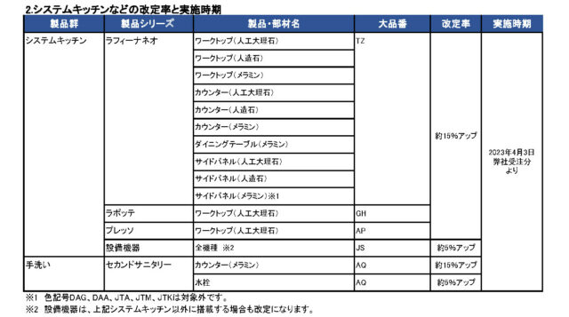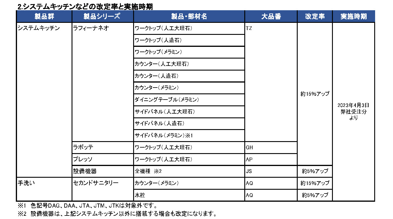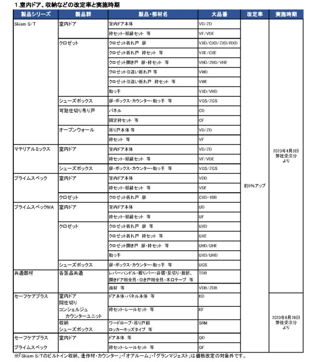 室内ドア、収納などの「Skism S/T・マテリアルミックス・プライムスペック・プライムスペックMA・共通部材」、「システムキッチン・手洗い」は4月3日受注分から適用。室内ドアなどの「セーフケアプラス・セーフケアプラス プライムスペック」は6月26日受注分から適用する。