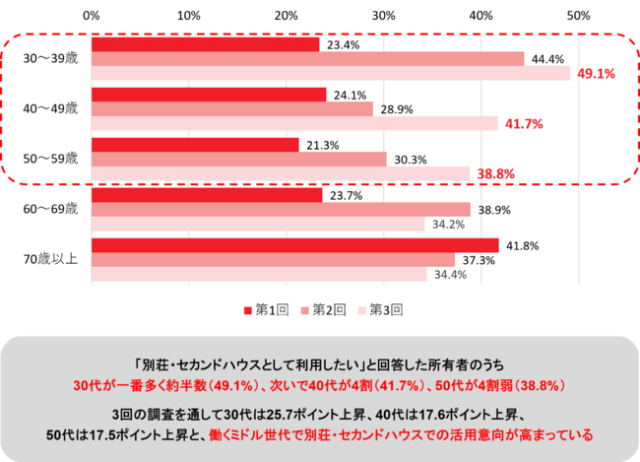 「別荘・セカンドハウス」での活用意向者を年代別でみると、30~50代のミドル世代で高まっていることがわかった。30代は第1回調査(23.4%)から25.7ポイント上昇し、約半数が利用を希望している。40代は17.6ポイント上昇し41.7%、50代は17.5ポイント上昇し38.8%となり、若い世代ほど別荘・セカンドハウスでの利用意向が高い。コロナ禍をきっかけにテレワークが普及し、働く場所の選択肢が広がったことで、現役で働いている世代に意向の変化があったと考えられるとした。