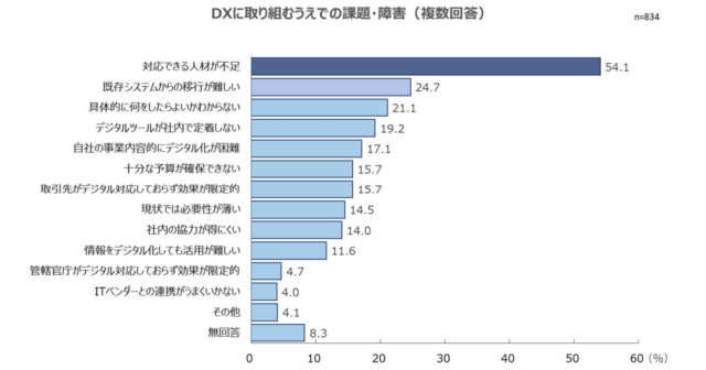 DXを推進するうえでの課題・障害については、「対応できる人材が不足」(54.1%)が過半数を占め、「既存システムからの移行が難しい」(24.7%)が続き、中小企業において「DX人材」の不足が、取り組みへの大きな阻害要因となっていることがわかった。また、DXの必要性を感じながら取り組めていない企業を中心に、約2割が「具体的に何をしたらよいのかわからない」と回答した。