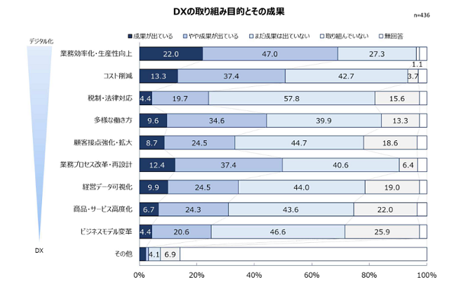 DXに「取り組んでいる」436社において、成果がもっとも出ているのは「業務効率化・生産性向上」で、「成果が出ている」(22.0%)、「やや成果が出ている」(47.0%)を合わせて69.0%が成果を実感していた。次いで「コスト削減」が50.7%(「成果が出ている」13.3%、「やや成果が出ている」37.4%)となり、業務の一部をデジタル化して効率化する「デジタイゼーション」が取り組みの中心となっていることがわかる。DXが目指す「ビジネスモデル変革」については、「成果が出ている」企業は4.4%、「やや成果が出ている」企業は20.6%だった。