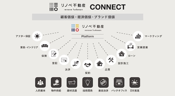 「リノベ不動産 CONNECT」は、リノベに関わる様々な企業・サービスが参画し、それらを組み合わせることでプラットフォームバリューの拡大を目指すアライアンスプログラム。今回のキャッシュフロー改善のほか、アフターの独自サービス、不動産売買のオンラインサービス、人材、建材流通、損保など、複数企業との提携およびサービスの提供を予定しているという。