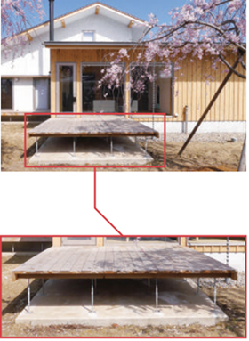 ◉デッキは鋼製束で組むことが多い。積雪があるので、木製の束はメンテナンスが大変。側面をブロック基礎にし、土を盛って庭と連続させることもある。束は3尺ピッチで配置