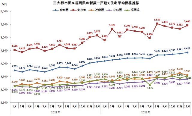 新築一戸建ての平均価格は、首都圏(1都3県)が前月比1.0%増の4424万円と3カ月連続で上昇した。東京都は2.4%増の5460万円と4カ月ぶりの上昇となった。千葉県は3793万円(1.7%増)で6カ月連続上昇、埼玉県は3807万円(1.3%増)で3カ月連続上昇したが、神奈川県は4746万円(1.8%減)で3カ月ぶりに下落した。大都市圏では、東京23区が8560万円(12.9%増)、都下が4880万円(1.2%増)と反転上昇したが、横浜市は5431万円(4.8%減)、川崎市は5620万円(5.0%減)と反転下落した。郊外都市では、千葉市(2.8%減)のみ下落となった。首都圏は10月以降の上昇傾向が概ね継続しており、建築コストの上昇が影響していると考えられる。
