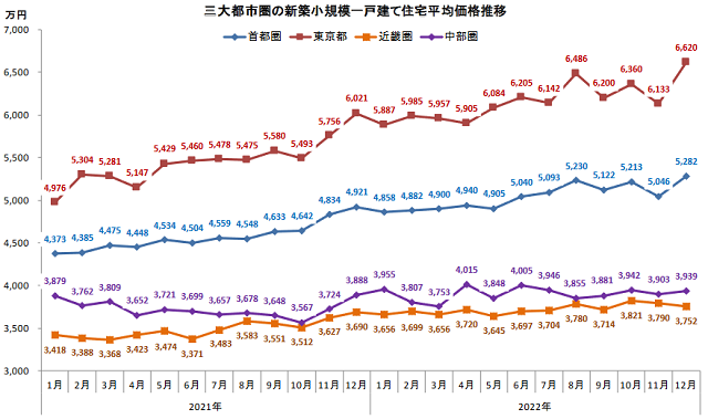 新築小規模一戸建て住宅の平均価格は、首都圏で前月比4.7%増の5282万円と反転上昇した。東京都は6620万円(7.9%増)、神奈川県は4704万円(1.3%増)、埼玉県は4334万円(1.0%増)と反転上昇し、千葉県は4273万円(0.9%減)と2カ月連続下落した。千葉県を除いて上昇し、11月の全面的な下落から持ち直したが、東京都以外は10月の水準に戻っていない。都市別では、東京23区(8.9%増)、横浜市(0.4%増)、川崎市(2.6%増)、相模原市(0.4%増)、千葉市(1.2%増)で上昇し、都下(1.9%減)とさいたま市(8.5%減)で下落した。