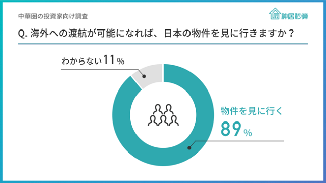 GA technologies(GAテクノロジーズ、東京都港区)は1月18日、グループ会社である神居秒算(東京都港区)が不動産投資に関心がある中華圏の投資家100人に実施した「日本不動産への関心と購入意欲」についての調査結果を発表した。それによると、89%の中華圏投資家が「海外への渡航が可能になれば、日本の不動産を見に行く」と回答。新型コロナ発生から3年経過した今も、日本不動産への関心の高さがうかがえる結果となった。