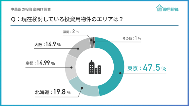 現在購入を検討している投資用物件のエリアは、「東京」が47.5%、「北海道」が19.8%、「京都」「大阪」が14.99%。関心がある投資物件の種別は「1Rと1K」(40.6%)が最も多く、「ビル一棟」は28.7%、「タワーマンション」は12.9%だった。