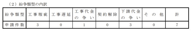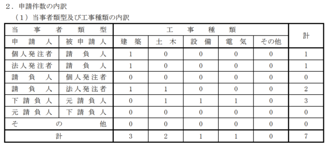 7件の申請を当事者類型別でみると、「下請負人→元請負人」3件、「請負人→法人発注者」2件、「個人発注者→請負人」と「法人発注者→請負人」が各1件。工事種類は建築3件、土木2件、設備と電気が各1件だった。紛争類型別では「工事瑕疵」と「下請代金の争い」が各3件、「工事代金の争い」1件となっている。