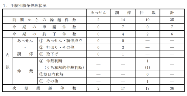 国土交通省は1月13日、中央建設工事紛争審査会が取りまとめた2022年度第3四半期の全国の建設工事紛争取扱状況を公表。今期の紛争処理申請件数は7件(調停7件)、前期からの繰越件数は35件(あっせん2件、調停14件、仲裁19件)、終了件数が6件(調停4件、仲裁2件)で、次期繰越が36件(あっせん2件、調停17件、仲裁17件)となった。