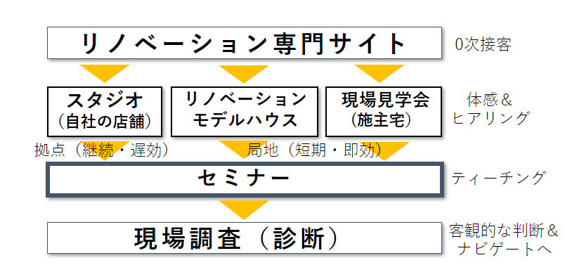 リフォーム業界の中で、リノベーション事業ならではの特徴の一つに接触頻度が増えるという点があります。営業フローの粒度を細かくしすぎると再現性も下がりますので、シンプルにすることが大切です。そして、複数の顧客接点の中でも、マインドセットの転換やランクアップさせるという大切な役割を担うのがセミナーです。法人向けはもちろん、新築事業でも当たり前であるセミナーが近年、リノベーション業界でも浸透してきているのは、伝える内容次第で顕在化されたニーズだけでなく、潜在的なニーズである本当に解決すべき問題を共有しやすくなること、内製化しやすく運用が容易であることも理由の一つでしょう。