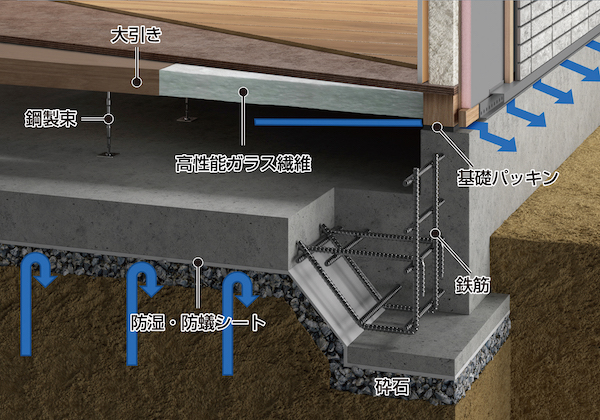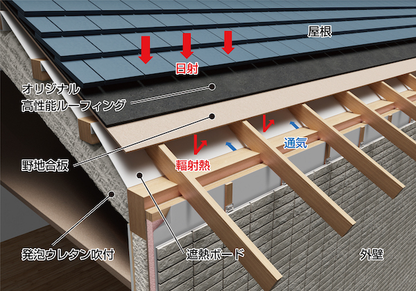 新商品は、新しいEes(=NEW Ees)から「N-ees(ニーズ)」と命名。屋根に遮熱ボード+発泡ウレタン吹付け、壁に内側発泡ウレタン80+外側フェノールフォーム30mmのダブル断熱、床下に高性能GW、開口部に高性能トリプルガラスサッシを採用し、UA値0.4以下、北海道エリアでも断熱等級5をクリアする建物とした。