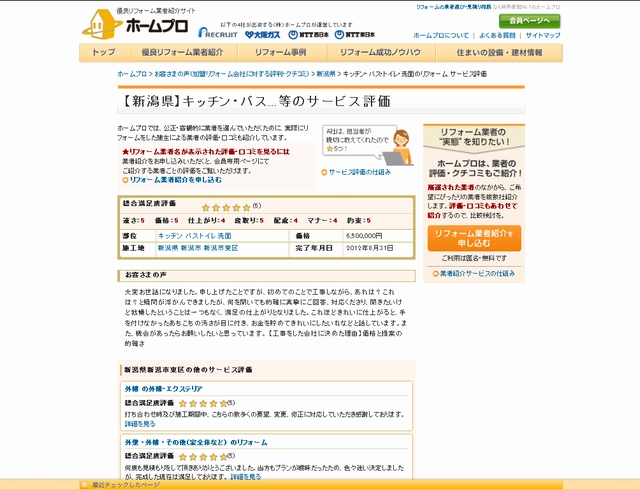 ホームプロでは、リフォーム会社を比較検討する際の参考材料として、加盟リフォーム会社の「評判・クチコミ」の情報をサイト上で公開している。クチコミは、実際に工事を依頼した施主会員が、工事完了後に、施工会社を評価している。