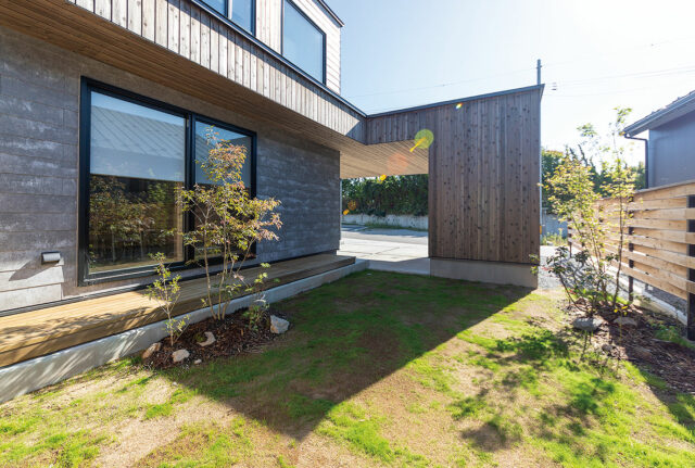 南面の庭は開放的な空間。東面の下屋で往来から視線を隠している