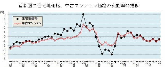 また、年間ベース(2011年10月-2012年9月)でも、「住宅地価格」「中古マンション価格」ともに値下がり率がやや縮小傾向となった。