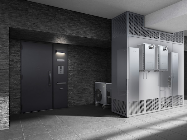 また、省スペース・メンテナンス性にも配慮している。バルコニー設置時のサイズを高さ2000(基礎・上部固定金具含む)×奥行1025mmまで小型化し、ガス熱源機とタンクユニットを一体設置することでバルコニーの美観を保つ。