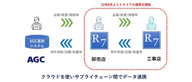 AGC(東京都千代田区)は1月27日、グループ会社のAGCアメニテック(東京都台東区)が2022年に開発した硝子工事積算システム「R7」を用いて、サプライチェーン間でガラスの品種や数量情報などのデータをクラウドで連携するトライアルを開始したと発表した。本格的な運用は2023年上期中に開始する予定という。