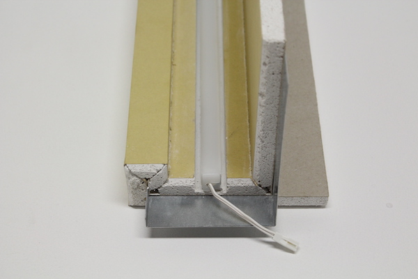 間接照明に使われる石膏ボードの台座面に溝をほどこすことで、テープライトなどの超薄型間接照明を埋め込んで間接照明まわりの造作を薄型化できるオプションサービス。溝は器具の大きさに合わせて深さ・幅・位置をミリ単位で調整可能で、大型の間接照明台座でも彫り込みを入れることにより器具の大部分をユニット内に埋め込んで見付けを薄く見せることができる。