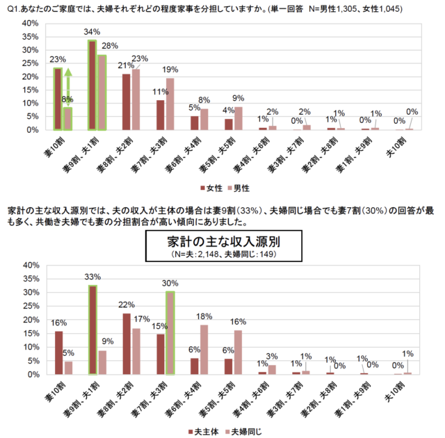 リンナイ(名古屋市)は1月31日、知的家事プロデューサーの本間朝子先生監修のもと、婚姻期間5年以上の20~60代の既婚男女2350人を対象に実施した「夫婦の家事分担」に関する意識調査の結果を発表した。家事の分担割合を聞いたところ、最も多かったのは「妻9割」(女性34%、男性28%)だった。男女差が大きかったのは「妻10割」で、女性が23%なのに対し男性は8%と、家事分担に対する認識の違いが伺える結果となった。また、家計の主な収入源が夫の場合、家事を妻が9割行うのは33%、夫婦同じ場合でも妻が7割(30%)という回答が最も多かった。共働きであっても妻の分担割合が高い傾向にあることがわかる。