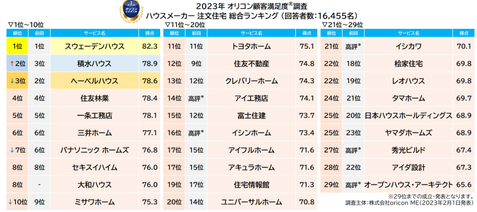 オリコン顧客満足度®調査のoricon ME(東京都港区)がこのほど行ったハウスメーカーの注文住宅の顧客満足度調査で、スウェーデンハウスが調査開始以来、9年連続で総合1位を獲得したことがわかった。2位は積水ハウス、3位はヘーベルハウスだった。