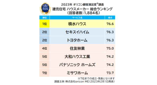 オリコン満足度調査ではこのほか、建売住宅(ビルダー/ハウスメーカー/デベロッパー)ランキングも発表。