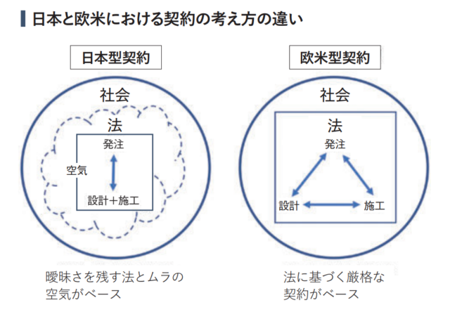 建物を建てる際の役割は発注・設計・施工に大別される。欧米の建築ではこれらは個人や法人として独立した3者の組み合わせであることが基本になる。これは欧米的な契約社会の考え方が前提となった仕組みだ。