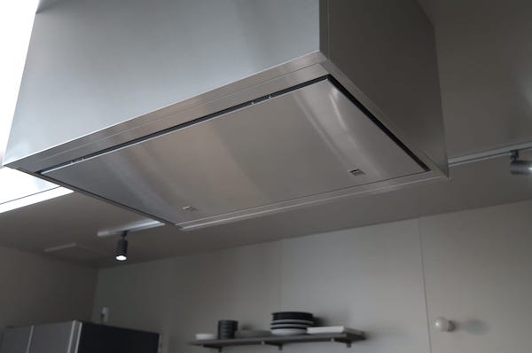 また、吸い込み力にもこだわり、本体底面の整流板回りのスリットを15mmとすることで、コンロ上から1m以上離しても細長いスリットが煙を逃さず吸い込めるようにし、見上げた時にすっきりと見えるようにした。