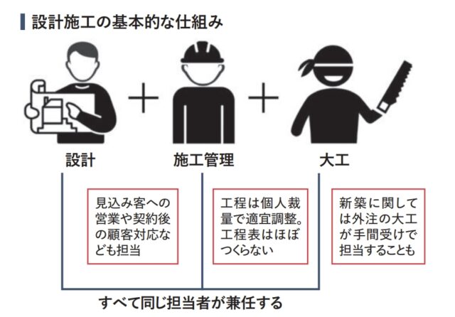 ◉「設計施工+大工」方式の利点の1つは担当者がすべてを把握できることと、監督として現場を仕切るほか、要所は自分で施工をするので意図通りの仕上がりが確実に得られる