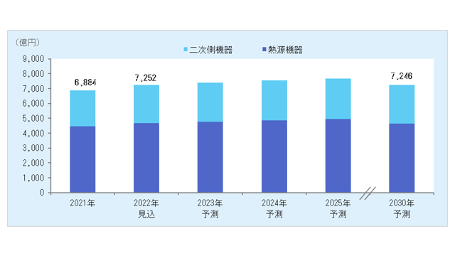 V2X(自動車用充放電器)は、住宅向けが中心で、スマートハウスなど高付加価値住宅のオプション設備や、環境・防災意識の高い層で導入が進んでいる。2018年度以降、大規模自然災害の発生に伴うBCP対策用や卒FITユーザーのPV自家消費用として市場が拡大。2022年度は、軽EVの普及に伴うニーズの拡大と補助金制度の一部緩和により、購入希望者が増加している。一部自治体では独自の補助金制度を設けるなどしており、2022年度は2021年度比48.3%増の43億円が見込まれる。今後もPV自家消費用・BCP対策用のニーズの増加や、部材不足による納期遅れの解消、新規メーカー参入などにより、2035年度は2021年度比16倍の465億円と予測する。