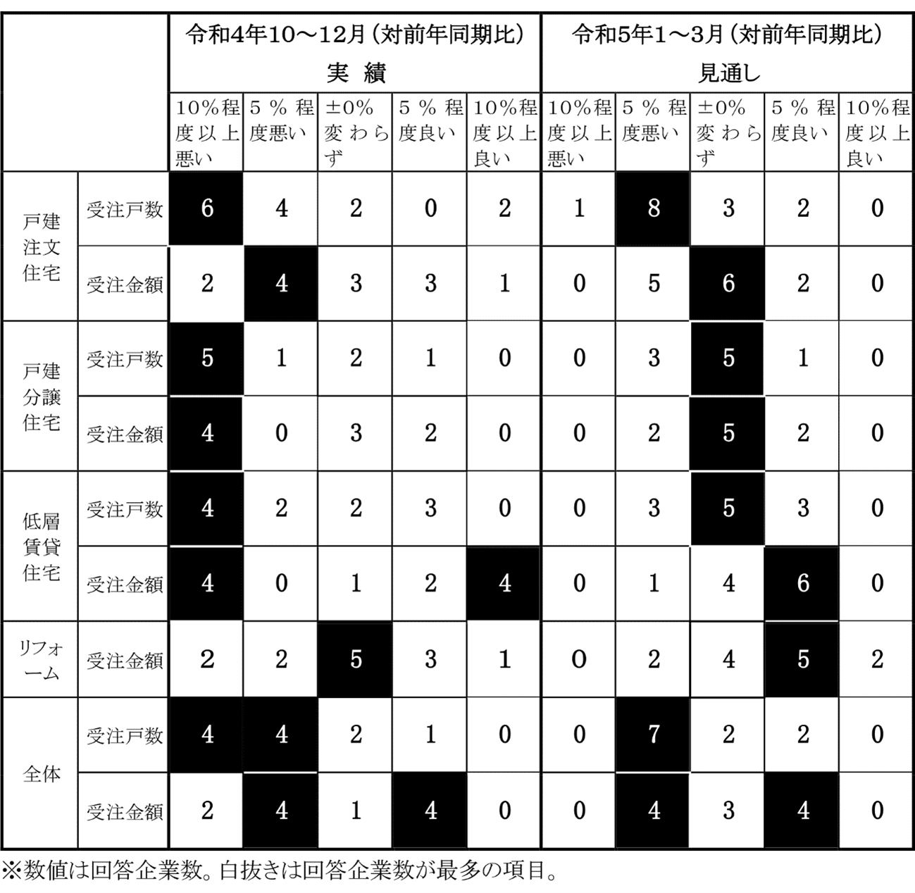 第4四半期(令和5年1~3月)の受注見通しは受注戸数-23ポイント、受注金額±0ポイントで戸数は3期連続のマイナス予想。「集客数やマインド回復に時間が掛かる」「顧客の資金計画の変更により受注までが長期化する」との見方がある一方で、各種支援策の活用や高付加価値提案により受注を目指すといった声もあった。