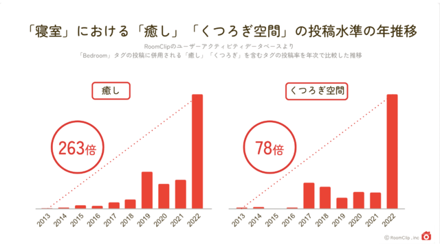 「RoomClip」で寝室の投稿に付与された「癒し」と「くつろぎ空間」それぞれのタグの投稿率を調べたところ、いずれも2010年代終盤から伸び始め、ここ1年で急激に上昇していることがわかった。「癒し」タグは約10年で263倍、「くつろぎ空間」タグは78倍となっている。