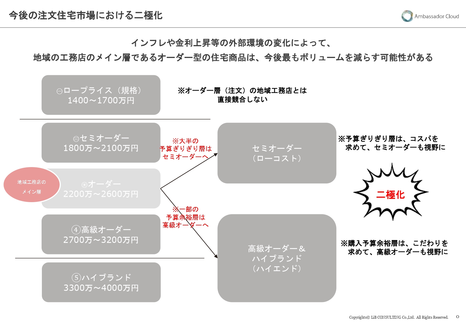 また、地域で力のあるセミオーダーの住宅会社(2000万円周辺)も、多拠点展開型のビッグビルダーとのシェア争いに勝つ必要があり、その為には、相当な商品力、ブランディング、コスト調整力が必要となる。現状の営業利益率が5%を切っている場合、現状の規模の大きさにかかわらず、生き残りが厳しくなることも充分に考えられる。