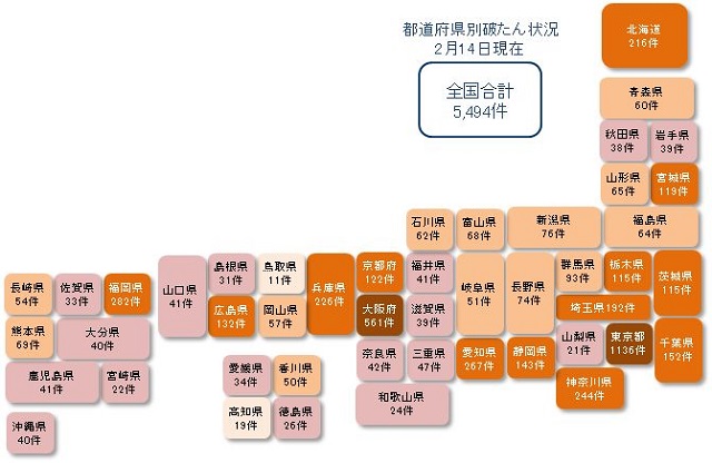 東京商工リサーチ(東京都千代田区)は2月14日時点で、「新型コロナ」関連の経営破たん(負債1000万円以上)が、全国で累計5230件(倒産5047件、弁護士一任・準備中183件)にのぼったと発表した。負債1000万円未満の小規模倒産を含めると累計5494件。