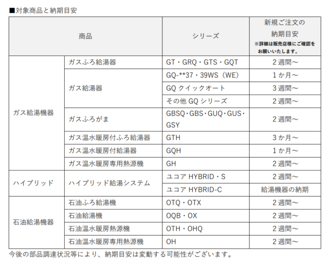 各商品の納期目安は以下の通り(同社ホームページより抜粋)。