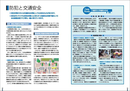 見開きごとに1つのテーマを扱い、見開きの左側のページでは、防犯活動とあわせて各テーマを実現するための考え方を分かりやすく解説。右側のページではそのテーマを切り口として、研究プロジェクトで支援・調査した事例を紹介している。