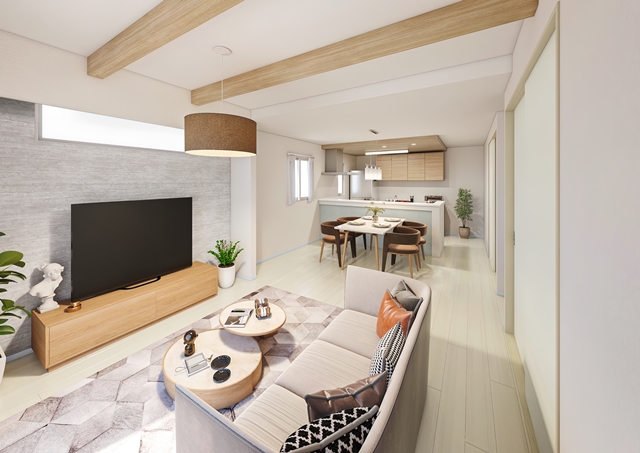 顧客の声から外装、内装デザインに着目し、特に人気の高いデザインを取り入れた。外観は、建物に光と影を楽しめる凹凸をつけ、シンプルながらも立体的で重厚な印象に。4つの外装パターンを用意した。外壁は3色貼り分けをして、異なる素材が調和するようにデザインされている。内装は開放感にこだわり、キッチン上部はアクセントクロスを使用した折下げ天井、リビングは化粧梁が見える折り上げ天井仕様とし、優雅でスタイリッシュな空間となっている。ベースの壁紙は白で統一、キッチンにはおしゃれなゲートスタイルカウンターが標準装備され、よりLDKと一体感を保てるような設計とした。