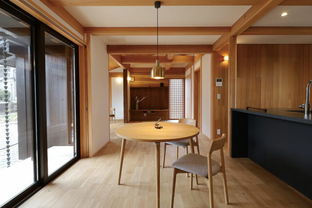 社員8人中6人が大工で、構造や造作・家具はもちろん建具まで自社で制作している木又工務店。大阪府枚方市に建つ民家調の「K邸」は、現代的な断熱・耐震性能を備えつつ、内部は高い大工技能によってあらわされた構造や造作、家具・建具の美しさが特徴だ。