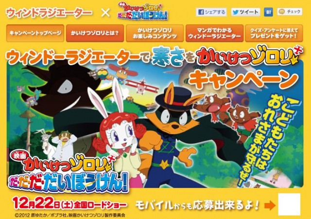 森永エンジニアリング(東京都港区)は10月15日、同社のオンラインショップ「ソラリスライフワールド」内に子ども向け映画「かいけつゾロリ だ・だ・だ・だいぼうけん!」の特設ページを開設し、「ウインドーラジエーターで寒さを『かいけつゾロリ』キャンペーン」を実施する。