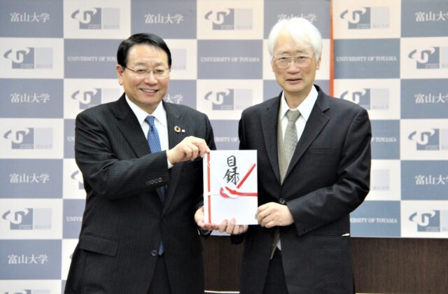 寄付⾦贈呈式の様⼦(左︓YKK AP代表取締役社⻑ 堀 秀充さん、右︓富⼭⼤学学⻑ 齋藤 滋さん)