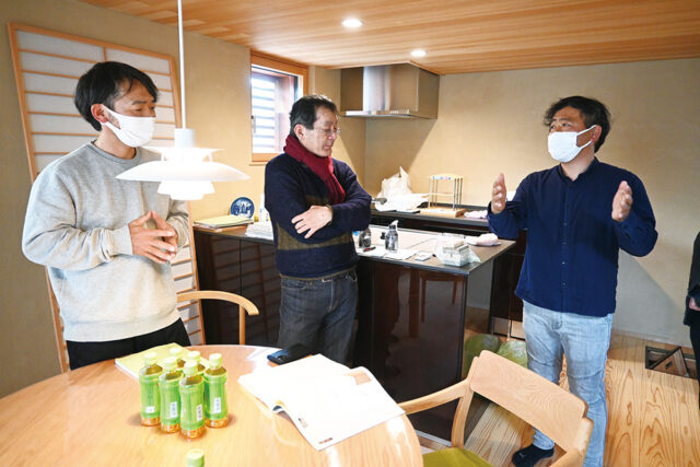 依田さん兄弟は、建物を見た伊礼さんに「外から見たたたずまいがいいですね。そとん壁の仕上げも丁寧できれい」と言葉をかけられると、感激した様子で「とてもうれしい」と顔をほころばせた・・・