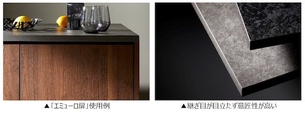 色柄の豊富さ、優れた耐熱・耐水・耐摩耗性、加工性、施工性によりキッチンや洗面、収納家具で多数採用されてきた「メラミン扉」の意匠性を向上。柄とエンボスを一致させることでリアルな木肌感を表現した木目柄、独自開発のグロス&マット加工により錆びた風合いを表現した鉄鋼板柄など、高意匠タイプのメラミン化粧板を表面に使用している。