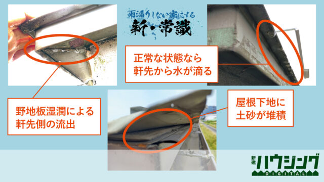 以上のような理由から、片流れ屋根では、、屋根の端部や外壁との取り合い部、雨樋周辺などで雨漏りのリスクが高くなる。私が、片流れ屋根の住宅を調査する際に注視するポイントもそこだ。