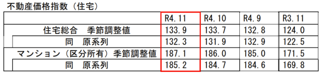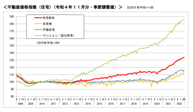 国土交通省は2月28日、2022年11月分の不動産価格指数(季節調整値)を公表した。2010年平均を100として算出したもので、全国の住宅総合は前月比0.2%増の133.9となった。住宅地は同1.4%減の111.1、戸建住宅は同1.3%増の116.0、マンション(区分所有)は同0.6%増の187.1だった。