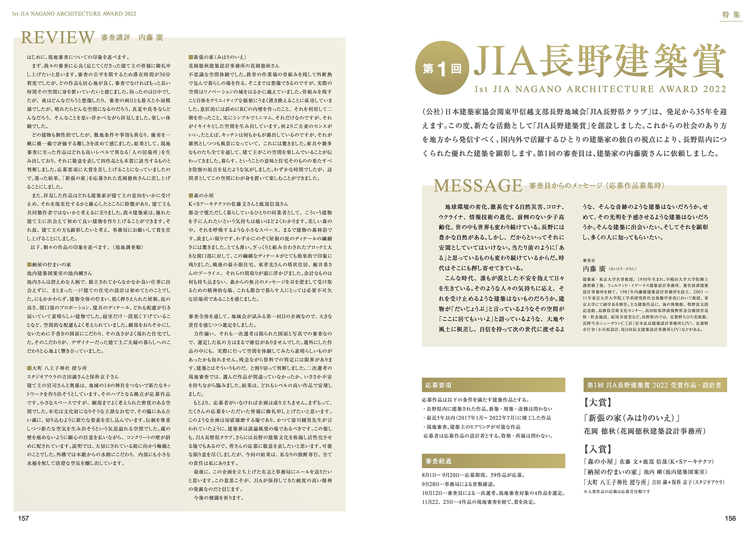 | 本文より― 私たち建築家の仕事の原点は、敷地を注意深く読み取り、建て主に寄り添い、その佇まい、プラン、断面の検討を何度も何度も往復し、悩み、空間を志向し、豊かな暮らしへの期待に応え、街並みに寄与すること、とも言えるでしょう。 つまり1軒の家とは、ひとりの建築家の発想と思考のプロセスの総体であると言い換えることもできます。本号は、その家に対する、その建築家の唯一の答え(=家のかたち、その発想)をテーマとします。 ご紹介する32の事例は、とりわけ「家のかたち」の手がかりとなる立地や周辺環境に着目し、「自然の中のかたち」、「田園・里山のかたち」、「街中のかたち」の3つに分類しました。ただ、このいずれにも共通しているのは、そこに建築家の「手の痕跡」があること。一見、余剰ともとれる空間の余白、窓の切り取り、素材の使い分け…。しかし建築家と住まい手によって慎重に考えられたそれらは、日々の暮らしに豊かさと美しさをもたらし、それは愛着や誇りとなって、その場所の価値は最大限に昇華します。 豊かな暮らしを実現する建築家の唯一無二の発想をご覧ください。 |